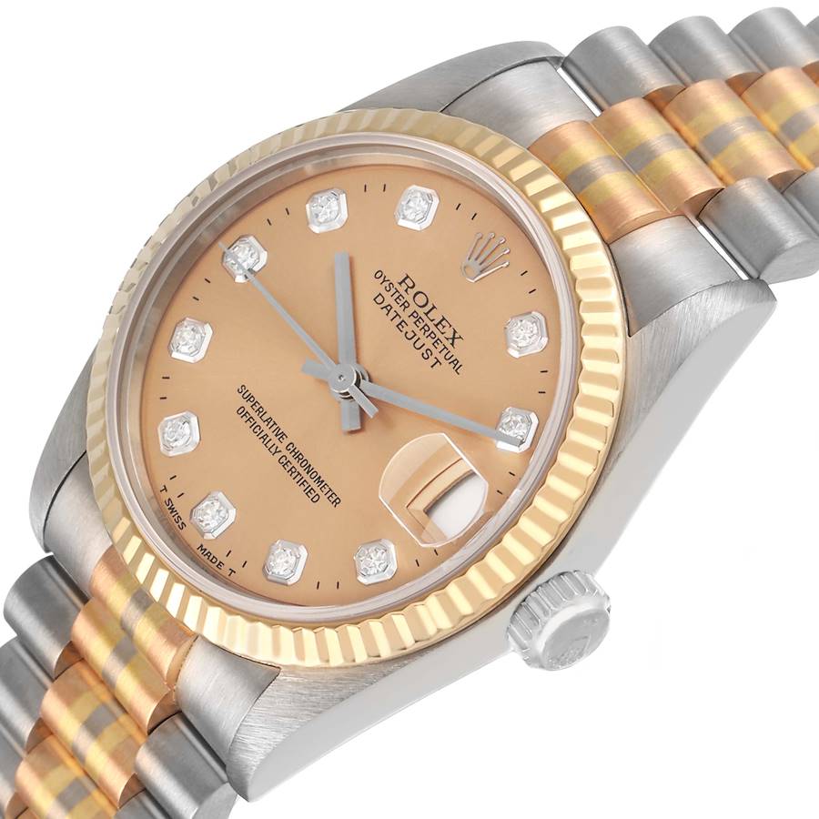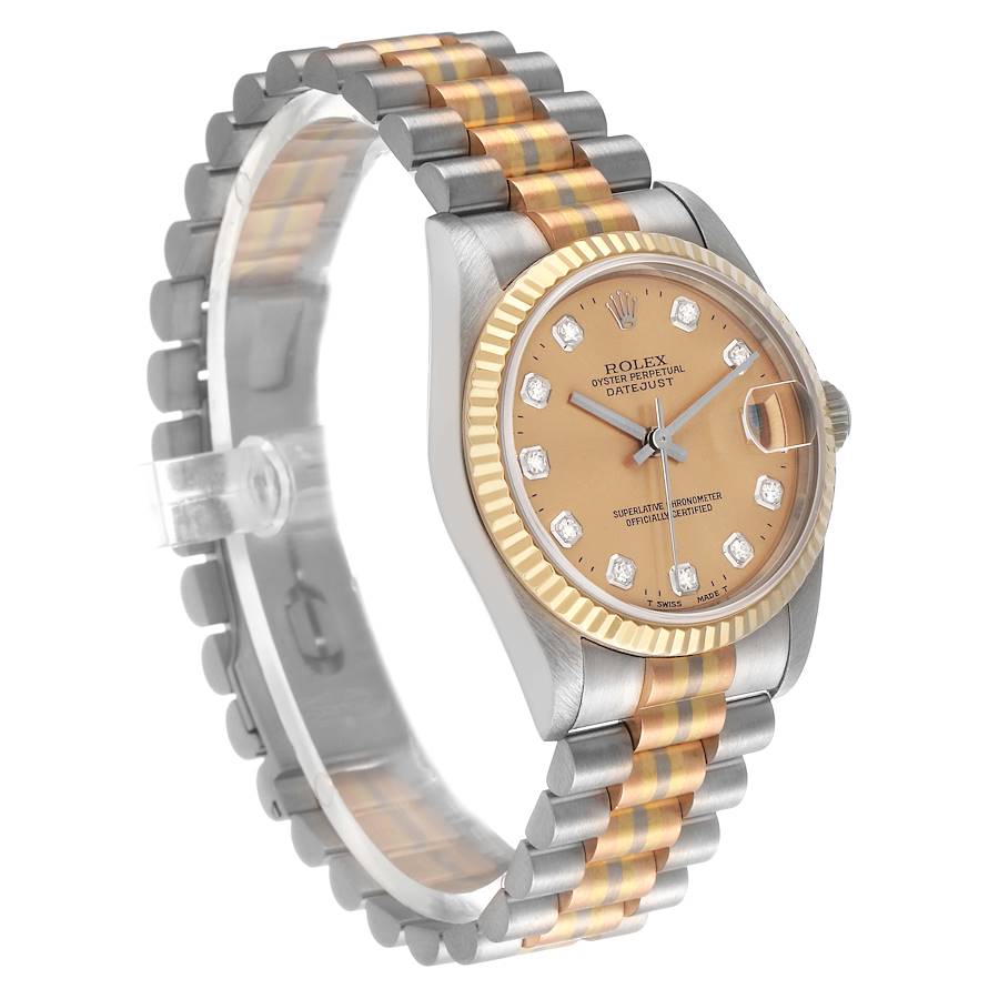Replique Rolex President Midsize Tridor White Yellow Rose Gold Diamond Montre 68279. Mouvement automatique a remontage automatique officiellement certifie chronometre. Boitier Oyster en or blanc 18k de 31.0 mm de diametre. Logo Rolex sur la couronne. Lunette cannelee en or jaune 18K. Verre saphir resistant aux rayures avec loupe cyclope. Cadran bronze avec index horaires en diamants d origine usine Rolex. Calendrier de date a l ouverture de 3 heures. Bracelet President Tridor en or 18k tricolore blanc jaune et rose avec fermoir dissimule. Convient a un poignet de 6 3/4".